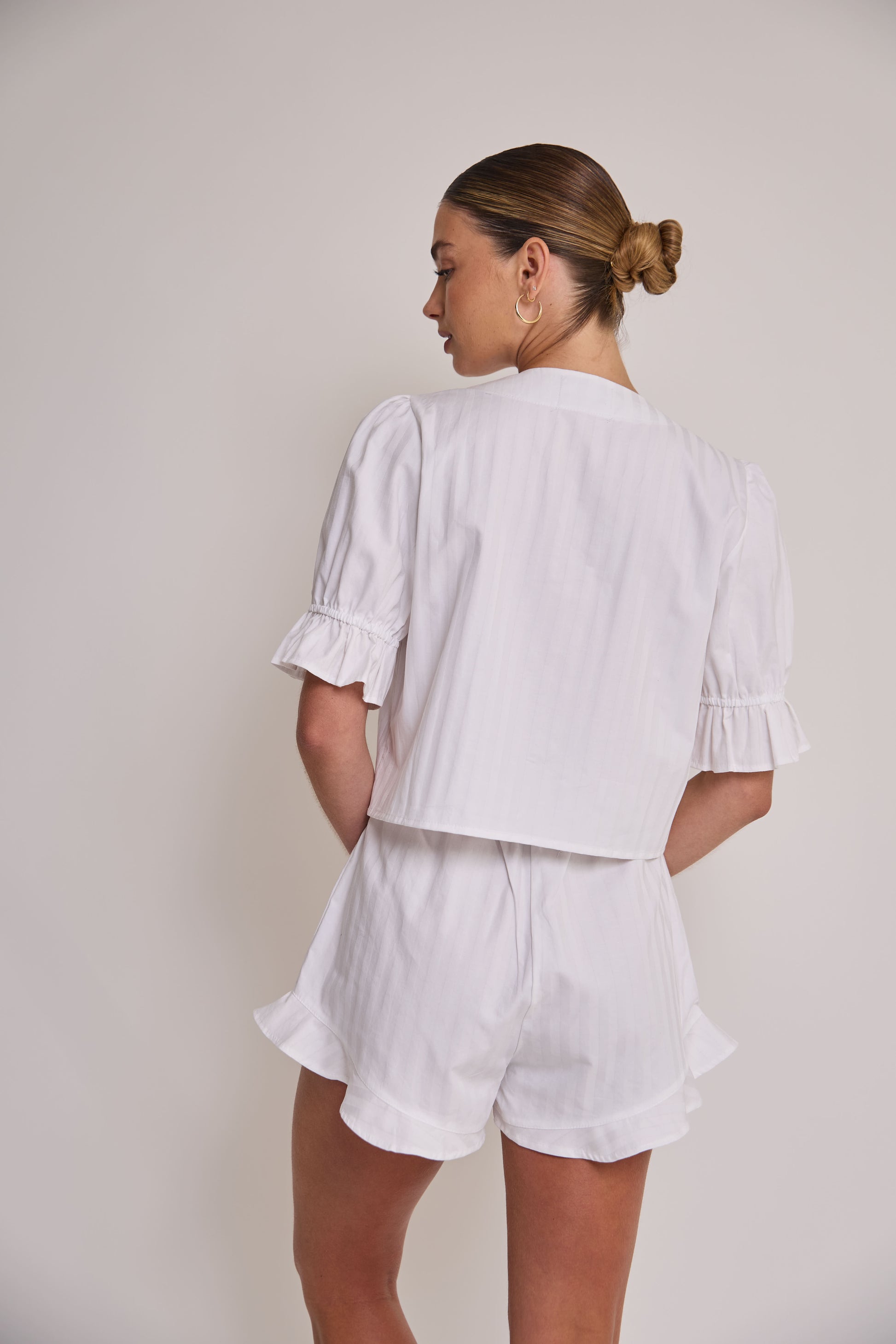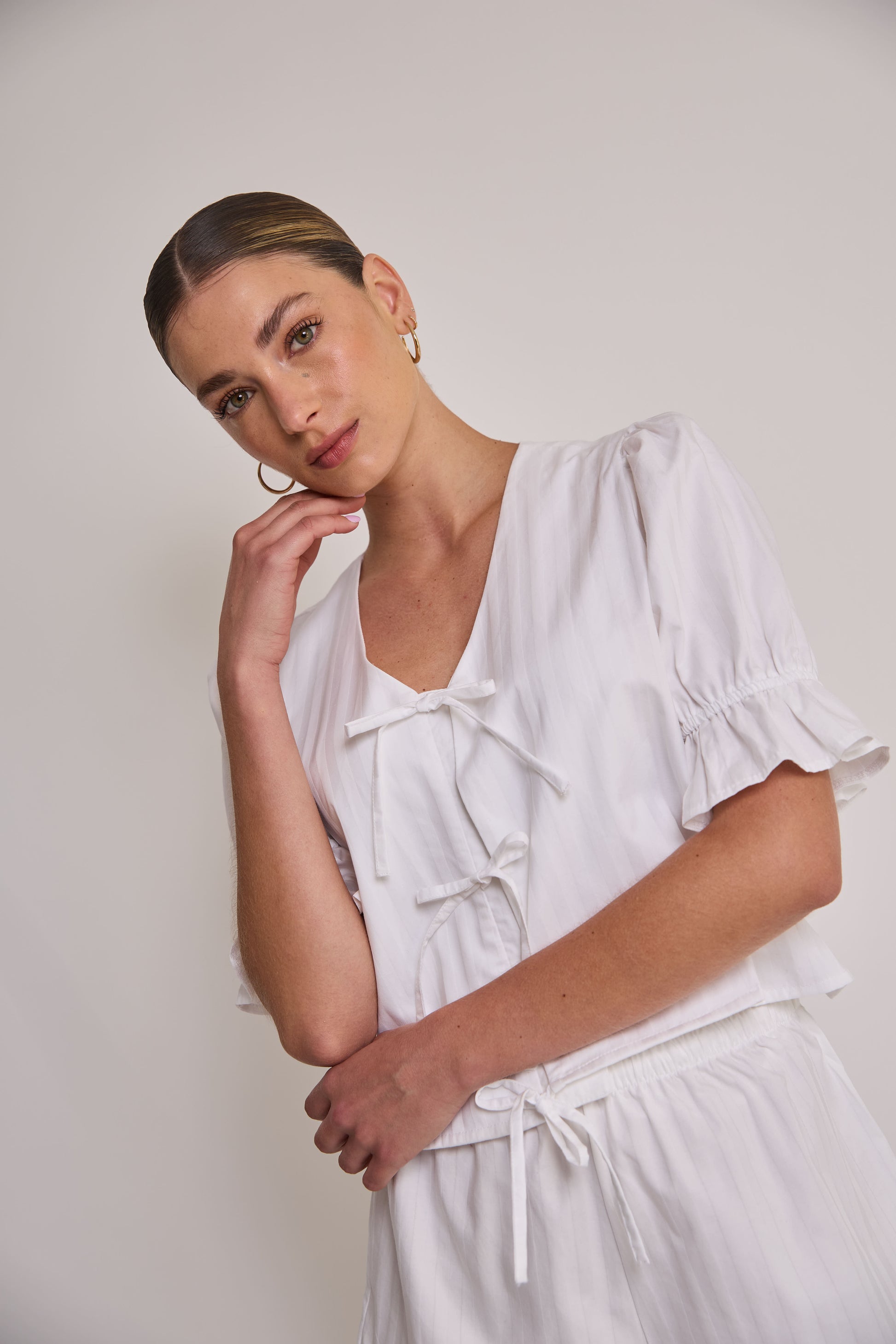 Con escote en V. Manga puff sleeve con elástico que no aprieta. Cierre en el centro mediante 3 amarras. Lleva un forro por dentro del mismo género, para evitar que se trasluzca.